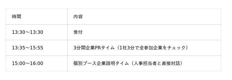 - 短時間で複数企業に触れられる:3分間PRタイムで一度に多くの企業情報を把握。- 人事担当者と直接対話:ブースでの質問や相談が可能。