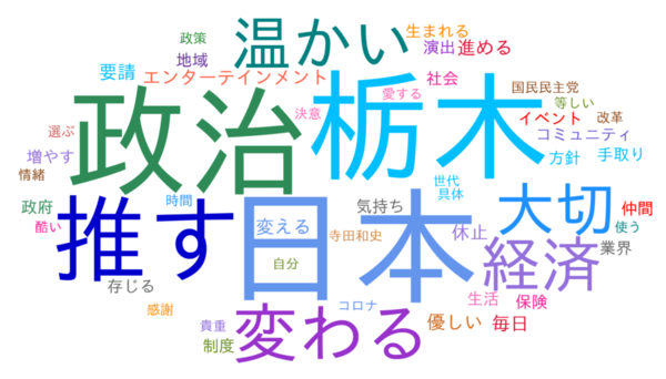 2月8日投開票される第51回衆院選の栃木1区では、計6人が立候補を届け出た。下野新聞デジタルでは、各候補者が第一声で訴えた政策や主張を、下野新聞社が提供する生成人工知能(AI)サービス「下野新聞生成AI」で分析。重要な言葉を視覚的に示した「ワードクラウド」にまとめた。届け出順に紹介する。