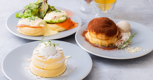 ハニーパンケーキ1,200円、ティラミスパンケーキ1,580円、エッグベネディクトパンケーキ1,680円(全て単品、税込)