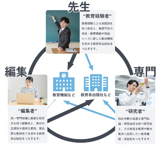 本事業は、近年の教育機関における教師不足、出版社における教材制作に精通した編集者の確保といった課題を解決すると同時に、長年教師や教材編集者として務め、退職・定年後もその高い専門性を活かして活躍したいという方々の要望にも応えることを目指しています。