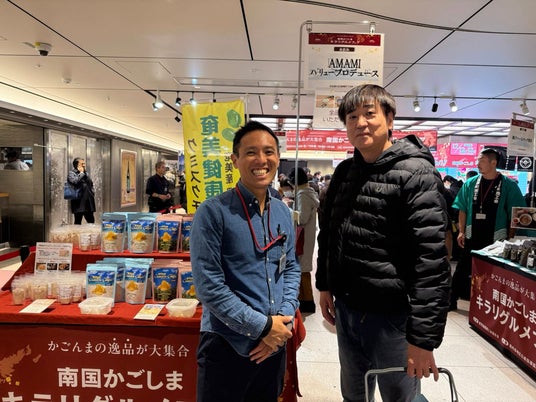 店頭に立つ林さん(写真左)と奄美PJを担当する三宅シニアプロデューサー(写真右)