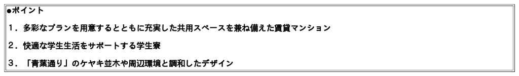 本複合施設は、2018年に営業終了したビジネスホテル「アークホテル仙台青葉通り」の跡地に建設された、東北エリア最大戸数(※2)を誇る高級賃貸マンション(地上15階建て、266戸)、学生寮(地上14階建て、258室)、コンビニエンスストアからなる大型複合居住施設です。