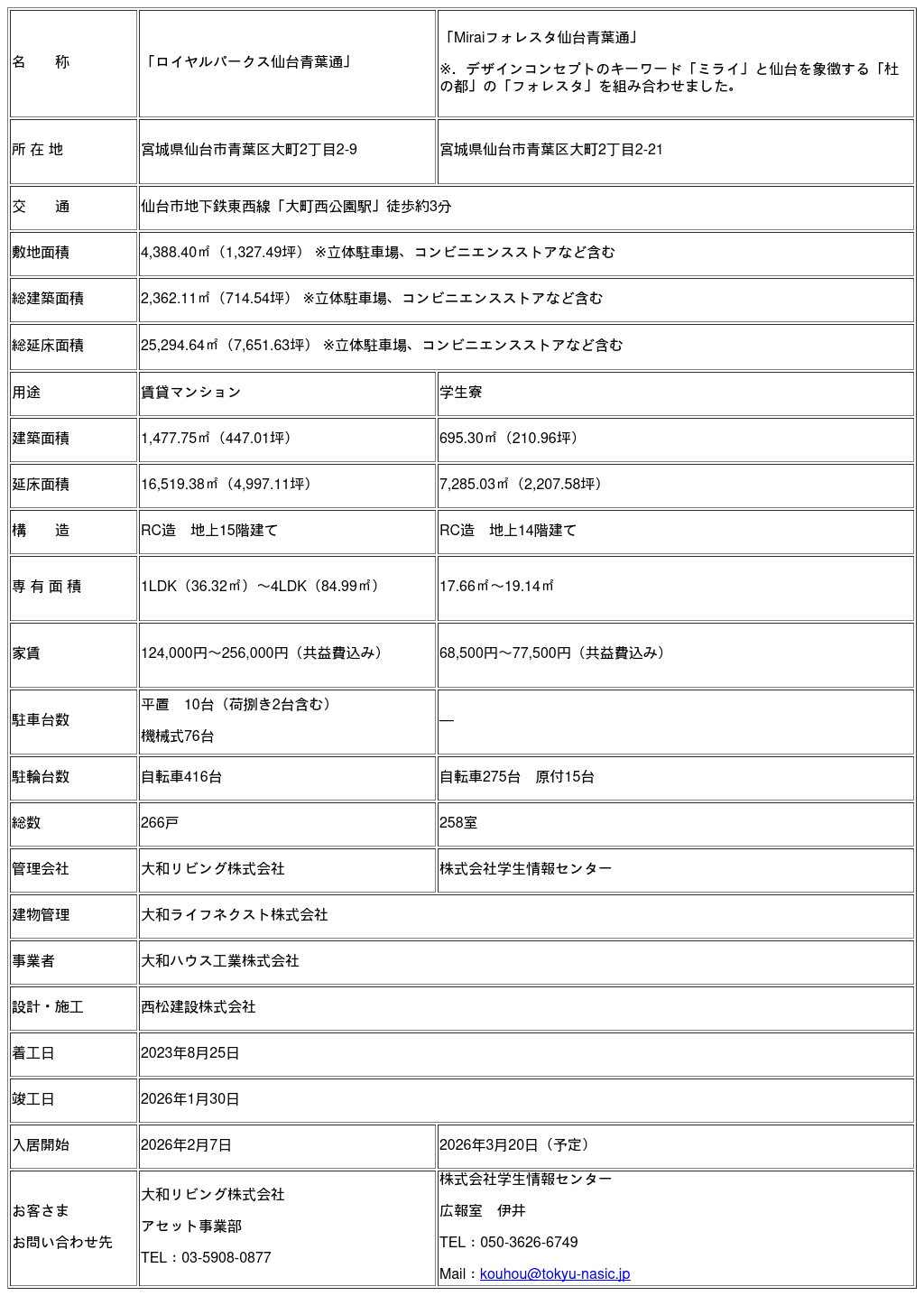 高級賃貸マンション「ロイヤルパークス仙台青葉通」・ 学生寮「Miraiフォレスタ仙台青葉通」竣工