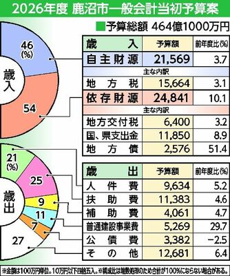【鹿沼】市は9日、2026年度一般会計当初予算案を発表した。総額は前年度比7%増の464億1千万円で過去最大。第9次総合計画の初年度で、地域拠点西小学校等整備や花木センターの再整備など投資的経費が前年度比28・1%増と押し上げた。松井正一(まついしょういち)市長は同日の記者会見で「総合計画に掲げた施策の着実な推進に向け、第一歩を踏み出す重要な年。積極的な予算編成を進めた」と述べた。