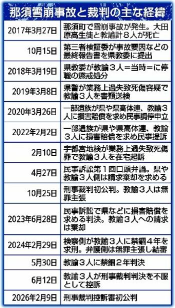 那須町で2017年3月、登山講習会中だった大田原高山岳部の生徒7人と教諭1人が死亡した雪崩事故で、業務上過失致死傷罪に問われ、一審宇都宮地裁でそれぞれ禁錮2年(求刑禁錮4年)を言い渡された男性教諭ら3人の控訴審初公判が9日、東京高裁(田村政喜(たむらまさき)裁判長)で開かれた。弁護側は一審判決の事実誤認や訴訟手続きの法令違反などを主張し、一審同様に無罪を訴えた。検察側は控訴棄却を求め、即日結審した。判決は3月4日。