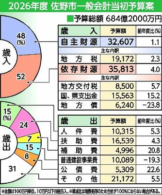 【佐野】市は9日、2026年度一般会計当初予算案を発表した。総額は25年度当初比2・6%増の684億2千万円で、5年連続で過去最大を更新した。デジタル地域通貨「さのまるペイ」の事業費や、文化会館改修工事をはじめとする大規模な施設整備事業費の増加などが要因。金子裕(かねこゆたか)市長は「まちづくりの基本理念“選ばれる佐野市”を目指し、新たな挑戦に取り組んでいく」と強調した。