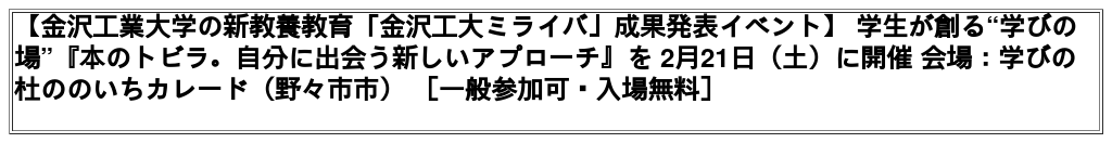 金沢工業大学(石川県野々市市)は、新しい教養教育「金沢工大ミライバ」(科目名:プロジェクト・ベースド・リベラルアーツⅠ)の成果として、履修学生25名(1・2年生・学部学科混成)による公開イベント 『本のトビラ。自分に出会う新しいアプローチ』を2026年2月21日(土)に、学びの杜ののいちカレードにて開催します。