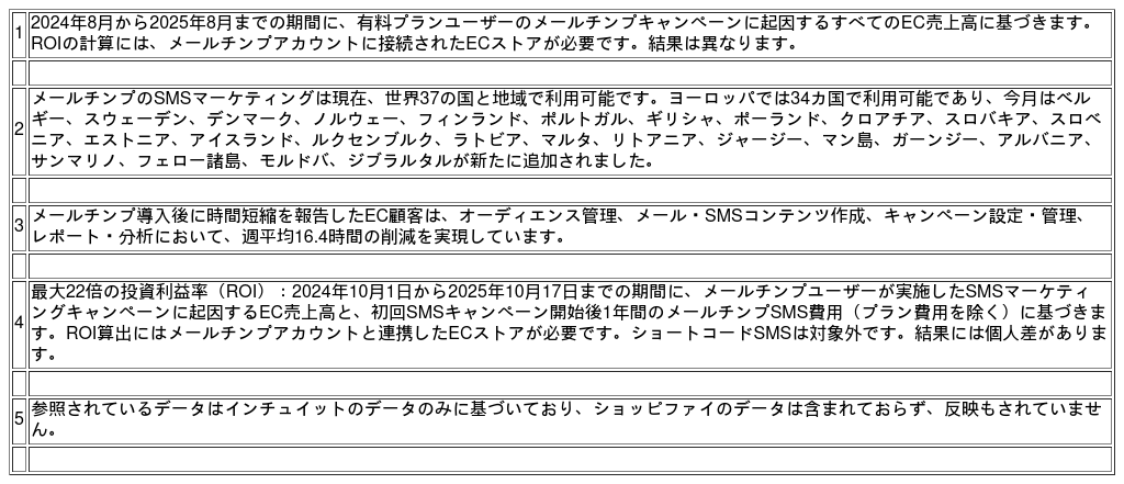 本情報は当社の製品の方向性を概説するものであり、いかなる義務も表すものではなく、購入判断の根拠として依拠すべきではありません。特定の機能やサービスには追加の利用規約、条件、料金が適用される場合があります。利用資格基準が適用される場合があります。製品提供内容、機能、仕様は予告なく変更される場合があります。機能と仕様はプランタイプによって異なります。メールチンプとショップイファイは別売です。連携機能は利用可能です。SMS(トランザクションSMSを含む)は、一部の国において有料プランのアドオンとして、申請および利用規約への同意後に利用可能です。