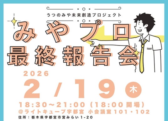 宇都宮市(市長:佐藤栄一)は、20代~30代の宇都宮市役所の職員と宇都宮市の民間企業の社員がつながり、官民連携で「宇都宮市にあってほしい取り組み」を検討するプロジェクト「うつのみや未来創造プロジェクト(通称:みやプロ)」の最終報告会を2026年2月19日(木)18:30~21:00、ライトキューブ宇都宮小会議室101、102にて開催します。今年度は、6つのチームが活動に取り組んでおり、最終報告会では、各チームが実践・実証を通して考えた、まちにあって欲しい取り組みを発表します。本プロジェクトに関心のある方、発表のテーマに近い取組をされている民間企業の方やNPO団体の方など、ぜひ奮ってご参加ください。なお本プログラムはNPO法人とちぎユースサポーターズネットワーク(代表理事:岩井俊宗)が事務局として運営補助を担います。