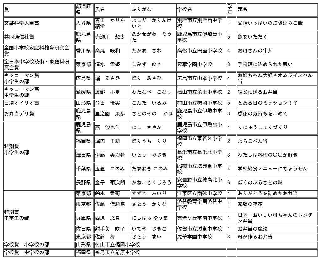 (株)共同通信社では、全国小学校家庭科教育研究会、全日本中学校技術・家庭科研究会と共催で小中学生を対象に、「弁当の日おいしい記憶のエピソード」と題して、自分で料理をした体験を作文にまとめ、写真や絵と合わせて募集しました。今年度は全国から小中学校合わせて2503点の作品が寄せられました。このたび審査の結果、最優秀賞にあたる文部科学大臣賞1名、優秀賞にあたる共同通信社賞、全国小学校家庭科教育研究会賞、全日本中学校技術・家庭科研究会賞各1名、キッコーマン賞2名、日清オイリオ賞、お弁当デリ賞各1名に加え、特別賞10名と学校賞2校を決定しました。詳細は別表のとおりです。
