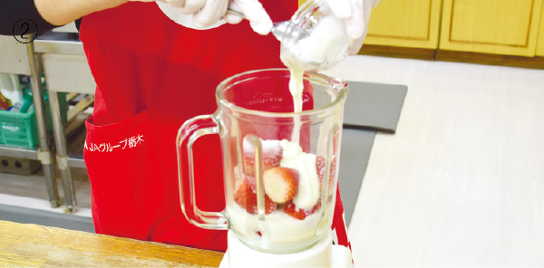 ③ グラスに注ぎ入れ、お好みでホイップクリームを絞り、飾り用のイチゴをのせる。