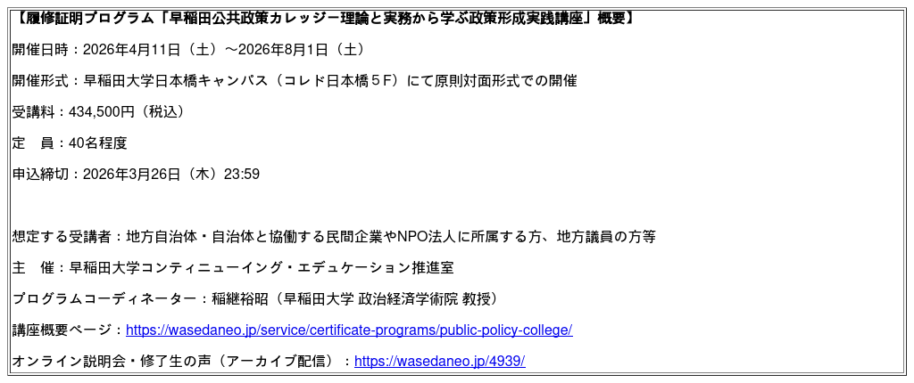 早稲田大学WASEDA NEO「早稲田公共政策カレッジ」が教育訓練給付制度認定