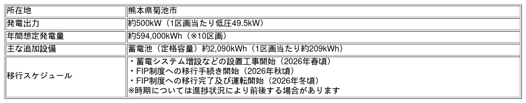 本プロジェクトでは、Tensor Energy株式会社(本社:福岡市中央区)が提供する再生可能エネルギー発電事業プラットフォーム「Tensor Cloud」をアグリゲーション運用システムとして採用し、当社が保有する鹿児島県志布志市の低圧太陽光発電所10区画において、蓄電システムの併設とFIT制度からFIP制度への移行を見据えた運用の最適化を図ります。