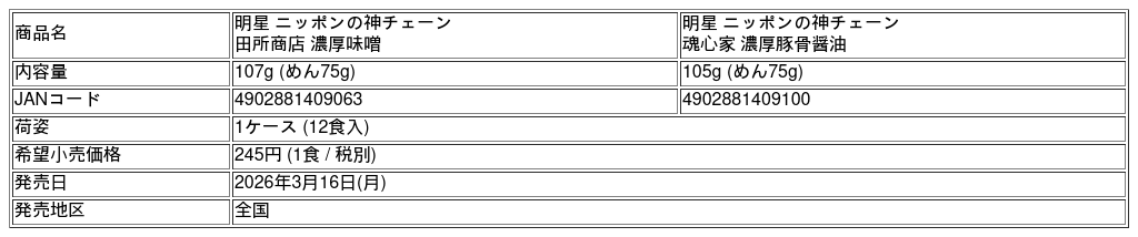 「明星 ニッポンの神チェーン 田所商店 濃厚味噌 / 魂心家 濃厚豚骨醤油」 2026年3月16日(月) 新発売