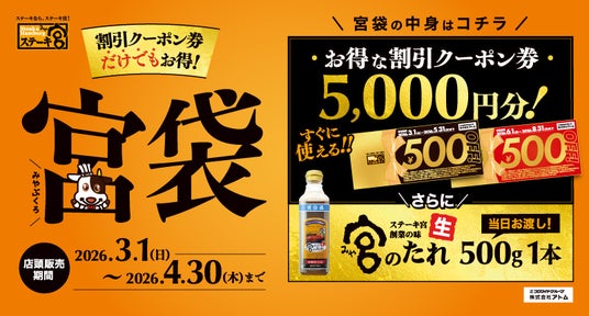 コロワイドグループの株式会社アトム(本社:神奈川県横浜市、代表取締役社長:植田剛史)が展開するステーキ宮では、お得なクーポン券と宮のたれがセットになった「宮袋」を、2026年3月1日(日)より販売いたします。