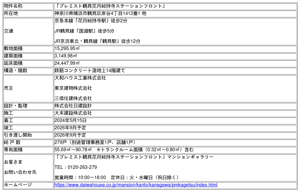 大和ハウス工業株式会社(本社:大阪市、社長:大友浩嗣)は、東京建物株式会社と三信住建株式会社と共同で、神奈川県横浜市鶴見区において、分譲マンション「プレミスト鶴見花月総持寺ステーションフロント」(地上14階建て、総戸数279戸)を建設中ですが、2026年2月28日より販売を開始します。