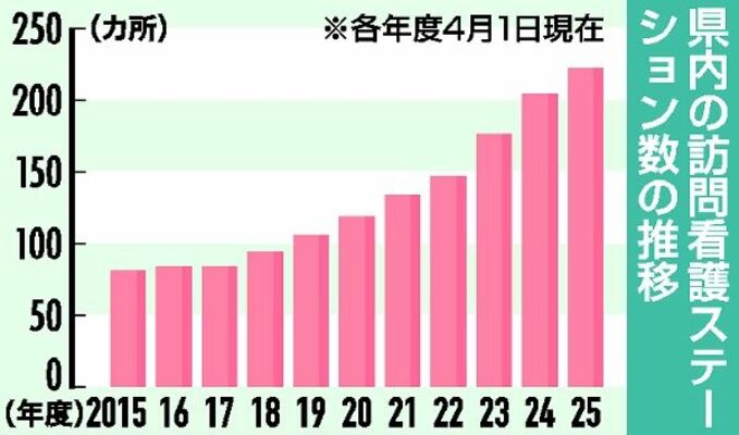 訪問看護師の拠点として在宅医療・介護の要となる訪問看護ステーションの2025年度の栃木県内設置数は222カ所となり、10年前に比べて2・7倍に増えたことが28日までに、県のまとめで分かった。在宅医療の需要増を受けて右肩上がりとなっている一方、人口10万人当たりでは都道府県別で36位にとどまっている。設置場所も人口が多い市町への開設が多く、地域偏在の解消には至っていない。
