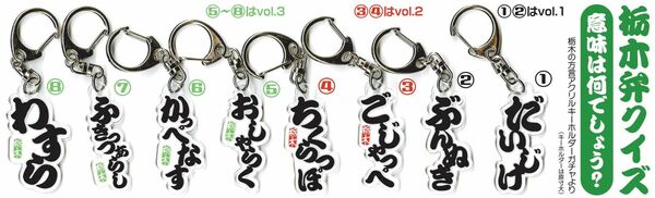 欲しいの出なくてもいじやけないでくれや-。街なかなどにあるカプセル玩具自販機(ガチャガチャ)の「栃木の方言アクリルキーホルダーガチャ」が人気を集めています。製作は大曽1丁目の印刷会社「プロテック」で、いわば街なか生まれ。紹介を兼ねてこのキーホルダーでクイズを作ってみました。栃木弁の意味が分かりますか?