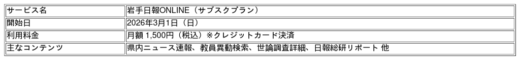 株式会社岩手日報社(本社:岩手県盛岡市)は、2026年3月1日(日)より、ニュースサイト「岩手日報ONLINE」において月額1,500円(税込)の有料会員制サービスを開始いたしました。 紙面記事の速報に加え、詳細なデータや過去の連載企画、さらに「公立学校教員異動」の検索機能など、デジタルならではの付加価値を提供し、地域社会の「知りたい」に即応する新しいニュースプラットフォームを展開します。