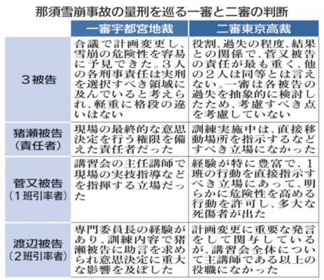 田村裁判長は判決理由で、3被告の雪崩事故発生の予見可能性や過失を改めて認定し、有罪を維持した。一方で「刑事責任の軽重に格段の違いはない」とした一審の量刑判断に対しては、3被告の立場や役割などの差を踏まえておらず「過失の軽重の評価を誤った」と指摘した。