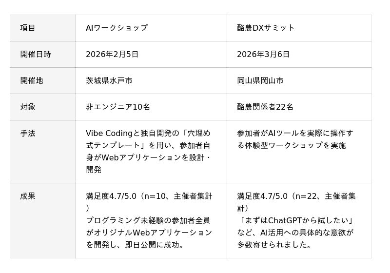 Metagri研究所は、2026年2月~3月にかけて2つの現場でAI活用ワークショップ(※3)(※4)を実施し、いずれも高い成果と満足度を記録しました。