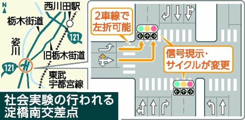 【壬生】栃木土木事務所は18日から、安塚の栃木街道淀橋南交差点で交通渋滞緩和に向けた社会実験を始めた。第1弾として国道121号から東へ進む路面標示を変更し、2車線での左折ができるようにした。さらに4月からは栃木街道の南進・北進方向に矢印信号を増設する予定。同事務所企画調査課は社会実験を通して交通の円滑化につながることを期待している。
