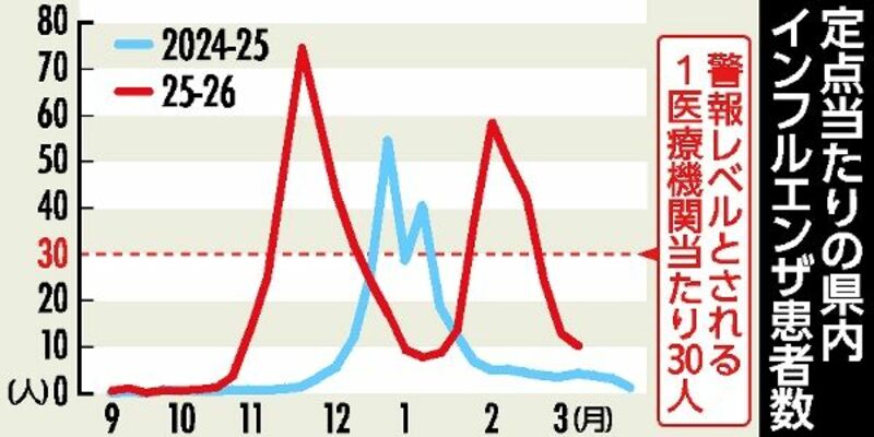 県保健福祉部は19日、県内の1医療機関当たりのインフルエンザ患者数(9~15日)が10・20人(前週13・49人)になったと発表した。5週連続で減少したが、警報レベルは終息基準(10人)を下回るまで継続される。