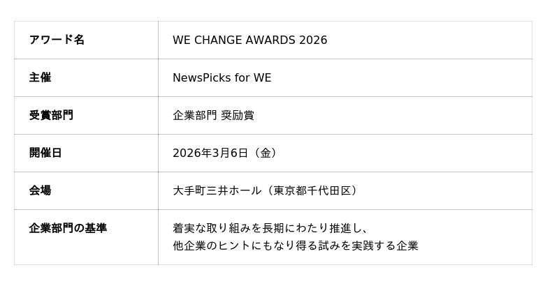本アワードは国際女性デーに合わせて開催され、「変化をつくる力を讃え、次へつなげる」をテーマに、社会変革に挑む個人・企業の取り組みを表彰するものです。企業部門では、着実な取り組みを長期にわたり推進し、他企業のヒントにもなり得る試みを実践する企業が選出されます。2025年4月の法人化からわずか1年目での受賞となりました。