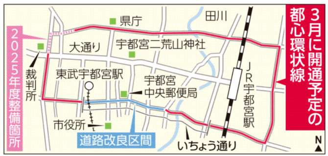 今回開通する都心環状線は、栃木県庁前を東西に走る県庁前通りと、JR宇都宮駅の東側、宇都宮中央郵便局前などを通るいちょう通り、宇都宮地方裁判所の東側などを巡る約7キロ。このうち、小幡・清住土地区画整理事業のエリアにかかる裁判所東側の宇都宮日光線(227メートル)と県庁前通りの塙田平出線の一部(93メートル)が28日開通する。
