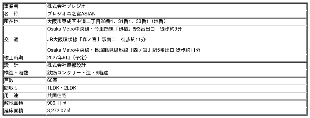 株式会社プレジオ(本社:大阪府大阪市、代表取締役社長:上山 祐平)は、大阪府大阪市東成区中道2丁目における新築賃貸マンション計画の名称を「プレジオ森之宮ASIAN」に決定し、2026年4月1日(水)に着工しましたのでお知らせします。なお、竣工は2027年9月を予定しています。