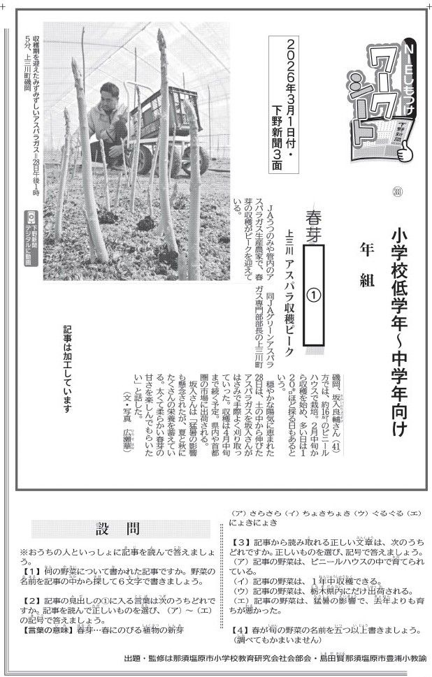 下野新聞の記事を使って社会への関心や読解力を高める「ワークシート」をスタートします。出題するのは、県小・中・高校教育研究会の国語・社会部会に所属する教員たち。ぜひ挑戦してください。