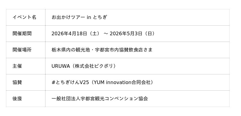クリエイター支援プラットフォーム「URUWA(株式会社ピクポリ)」は、一般社団法人宇都宮観光コンベンション協会の後援のもと、栃木県を舞台にした推し活観光イベント「お出かけツアー in とちぎ」を2026年4月18日(土)より開催します。