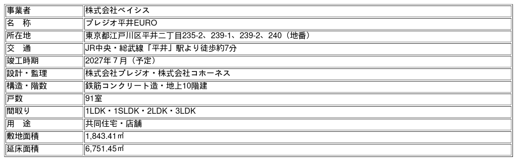 株式会社プレジオ(本社:大阪府大阪市/代表:上山 祐平)のグループ会社である株式会社ベイシス(本社:大阪府大阪市/代表:柴田 尋)は、東京都江戸川区平井二丁目における新築賃貸マンション計画の名称を「プレジオ平井EURO」に決定し、着工しましたのでお知らせいたします。なお、竣工は2027年7月を予定しております。