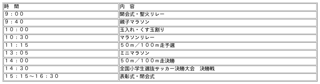 今年も「JA全農杯全国小学生選抜サッカー決勝大会」、各種トラック競技(親子マラソン、50m走、100m走、ミニマラソン)、「小学生卓球選手権大会」や「マラソンリレー」を実施。また、プロの指導によるかけっこ教室「かけっこアタック」も開催します。