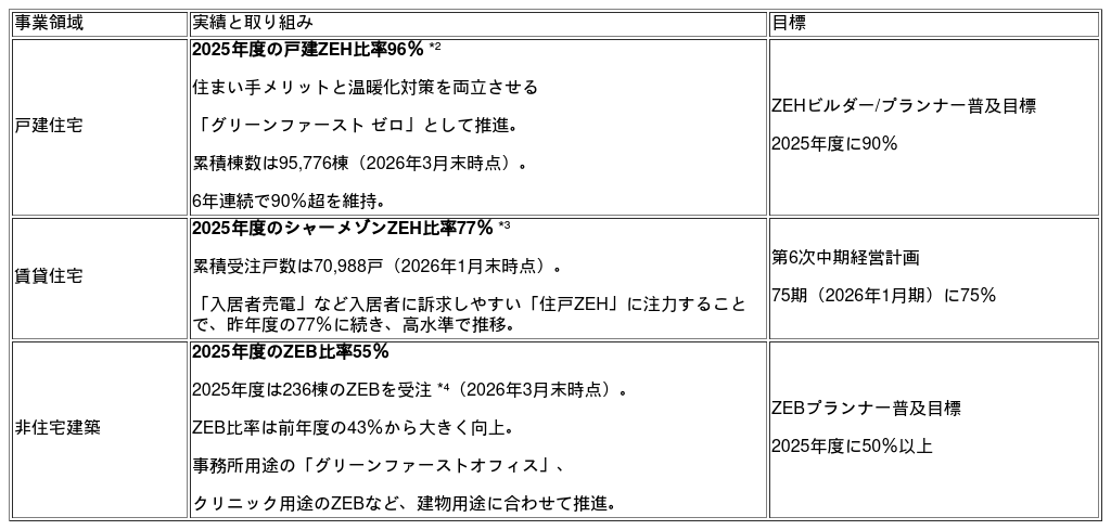 積水ハウス株式会社は、2025年度の戸建住宅ZEH比率96%(目標90%)、賃貸住宅「シャーメゾン」のZEH比率77%(目標75%)、非住宅建築のZEB比率55%(目標50%)となり、いずれも目標を達成*¹しました。2025年度は、国の「ZEHビルダー/プランナー登録制度」「ZEBプランナー登録制度」で設定した普及目標や、当社の第6次中期経営計画の最終年度でもある節目の年です。戸建住宅・賃貸住宅はともに高水準を維持し、非住宅建築においては、事務所用途の「グリーンファーストオフィス」やクリニック用途のZEB提案を強化した結果、ZEB比率前年度比12ポイントアップの55%と大幅に向上させました。