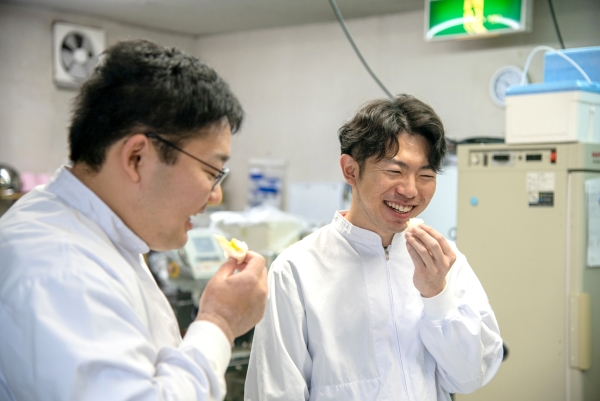 大学時代は中華料理店で6年間アルバイトをしていました。食べることが好きで食に興味関心があったことから食品業界への就職を選びました。「もっとおいしいものを作りたい」というこだわりが試作品の完成度を高め、夢中で作ることが仕事の楽しさにつながっています。現在はピザまんを担当し、チーズの伸びやコク、生地やトマトソースとの絶妙なバランスを追求しています。自分が手がけた商品が店頭に並ぶとうれしくなりますし、家族や友人に「おいしかった」と言われると誇らしい気持ちになります。