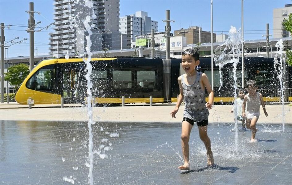LRTを背景に水遊び