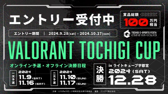 イナズマ株式会社(代表取締役:福田祐太)は、2024年12月28日(土)「とちぎeスポーツフェスタ2024(主催:とちぎeスポーツ地域活性化実行委員会)」にて開催される『VALORANT TOCHIGI CUP 2024』に向けた、予選大会の参加者募集とエントリー受付を、2024年9月28日(土)より開始しています。