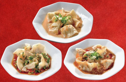 もちもち皮の水餃子 各480円(+tax )(左:ネギニラだれ / 中央:味噌マヨ / 左:ごま味噌坦々)