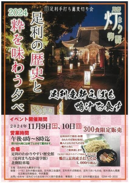 「足利の歴史と粋を味わう夕べ2024」では足利市内で栽培・収穫されたそば粉を使用し、職人による手打ちそばを鴨汁とともに数量限定でご提供いたします。ライトアップ商品券の利用も可能となっておりますので、この機会にぜひ足利プライドを込めた魂の一杯をお楽しみください。