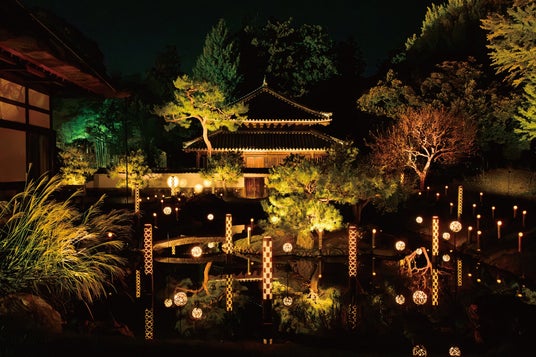 庭園や茶室をライティングし、園路には銘仙行灯等を設置いたします。