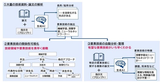 ―要素技術の特徴や課題、将来性などを多くの論文から自動的に分析・整理(図中3.)