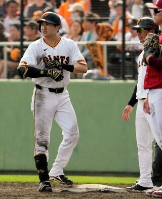 8回、3安打目を放った巨人・泉口=沖縄セルラー