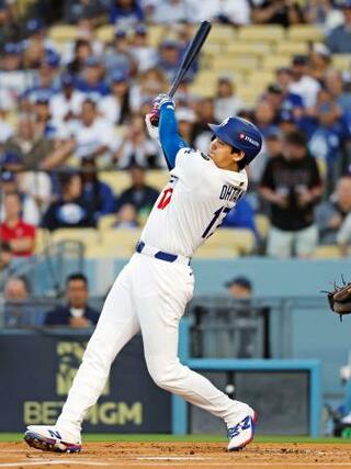 米大リーグ、ワイルドカードシリーズ第1戦のレッズ戦で、1回に先頭打者本塁打を放つドジャースの大谷翔平=9月30日、ロサンゼルス(共同)