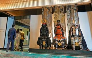 よろいかぶとが並ぶ「エスパシオ ナゴヤキャッスル」の宿泊者用エントランス=名古屋市