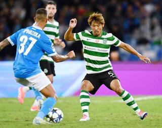 ナポリ戦の後半、競り合うスポルティングの守田=ナポリ(共同)