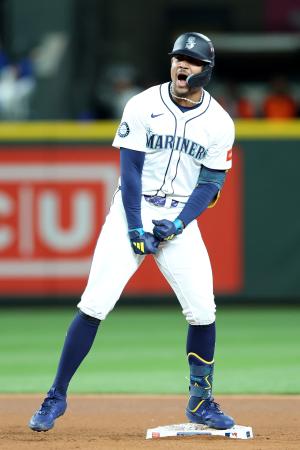 タイガース戦の八回、勝ち越しの二塁打を放ち、喜びを爆発させるマリナーズのロドリゲス=シアトル(ゲッティ=共同)