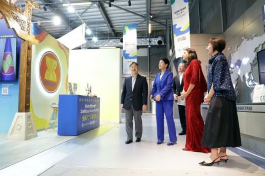 国際機関館を訪れ、ASEANの関係者から説明を受けられる天皇、皇后両陛下=6日午後、大阪市此花区の夢洲(代表撮影)