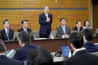 公明党の中央幹事会で発言する斉藤代表=9日午前、東京都新宿区の党本部