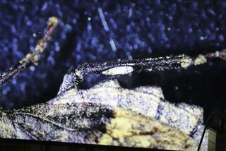 楕円形の「共生器官」がある雌のノコギリカメムシの後ろ足=15日、茨城県つくば市